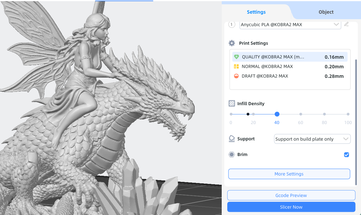 Depending on your printer and slicing settings, supports may be required for areas such as the wings, rider, and underside of the dragon.
