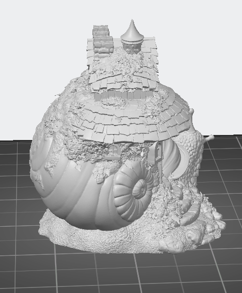 This beautifully detailed fantasy model features a cozy cottage built into a large spiral snail shell, complete with textured roofing, stone steps, and a charming snail companion beside the home.