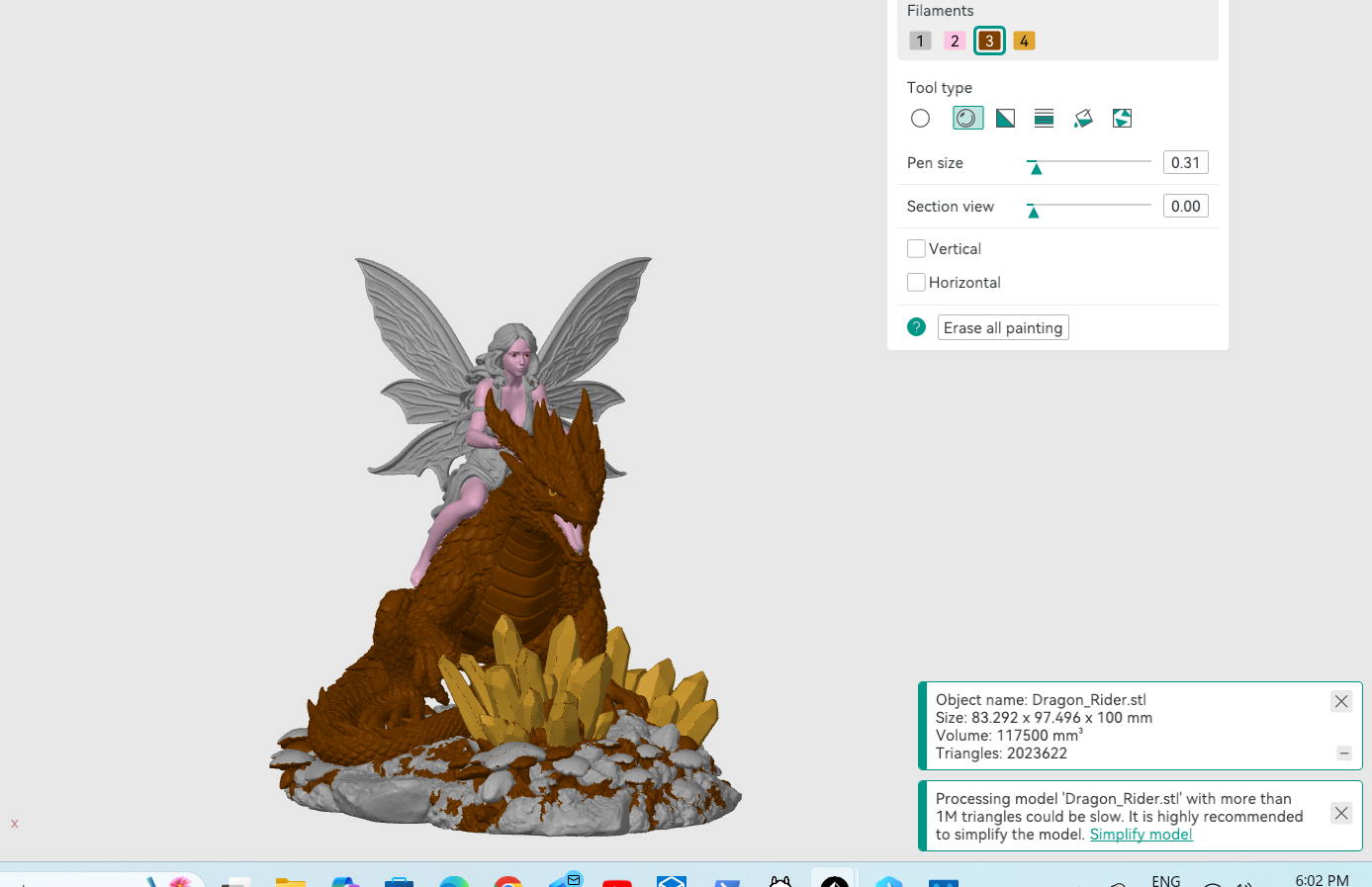 Depending on your printer and slicing settings, supports may be required for areas such as the wings, rider, and underside of the dragon.